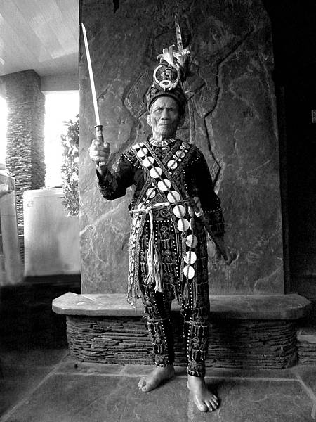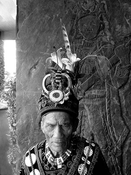 漢名巴里志的Pasakarlrane,已經退休很久,由兒子繼承家業。聽到有人從台北遠來採訪攝影,他高興地換上全套的魯凱族傳統服,佩著一把刀,站在他家那面勇士狩獵圖的石板浮雕前。他的帽子裝飾著山豬牙,插著兩朵百合花、一根雄鷹羽毛、一根孔雀羽毛。